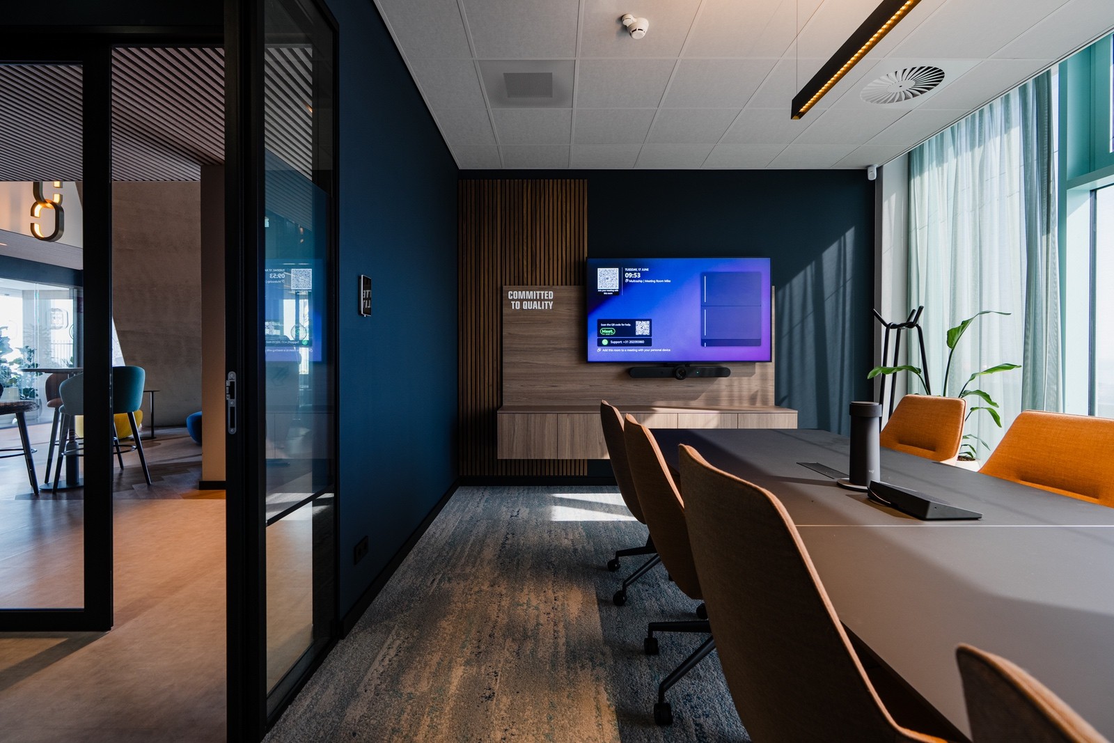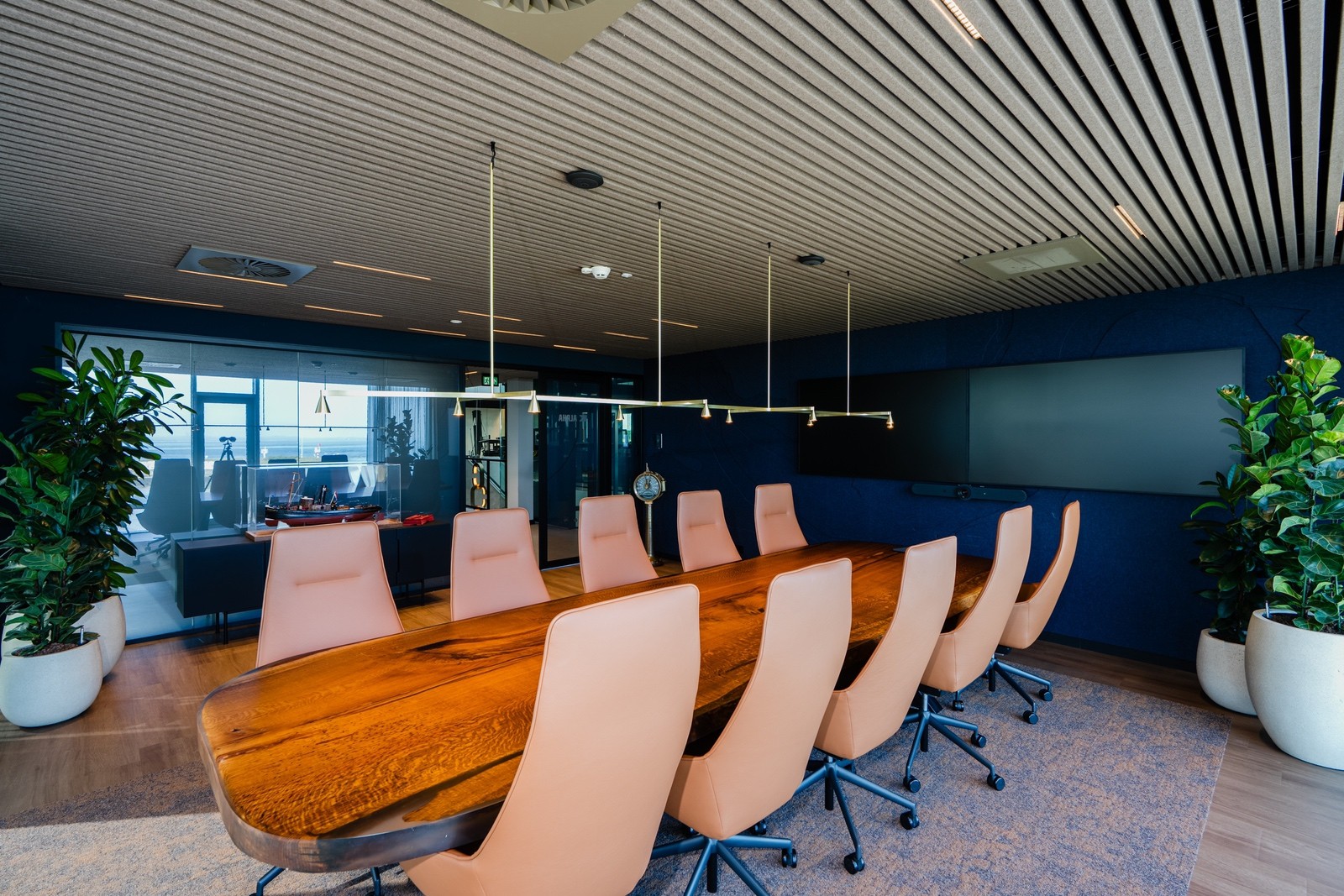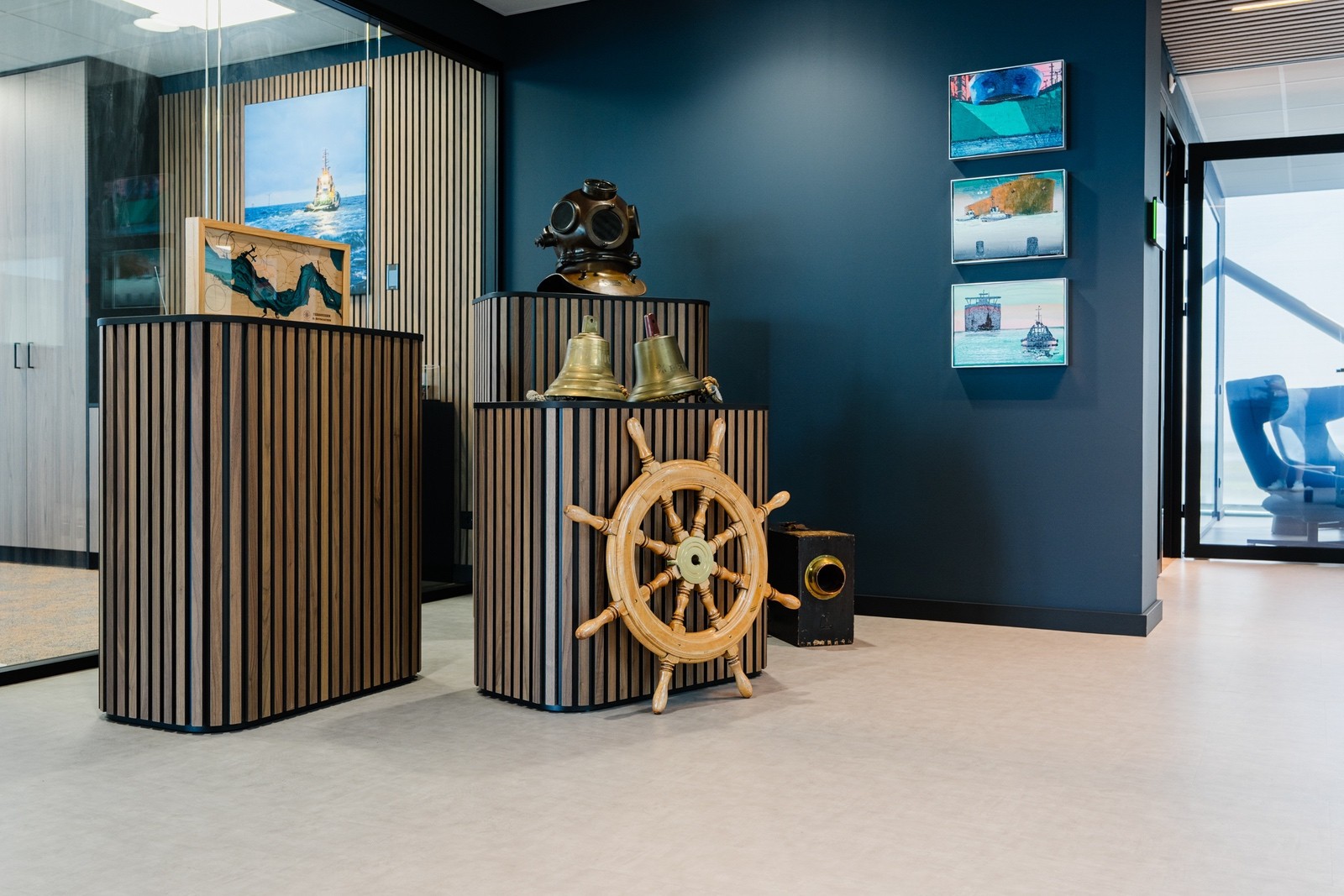 De boardroom is het pronkstuk: een imposante boomstamtafel op maat, een wand met viltbewerking van de Westerschelde en verlichting die het geheel afmaakt. In de gangen vertellen beelden en objecten het verhaal van Multraship een mix van trots, historie en toekomst.