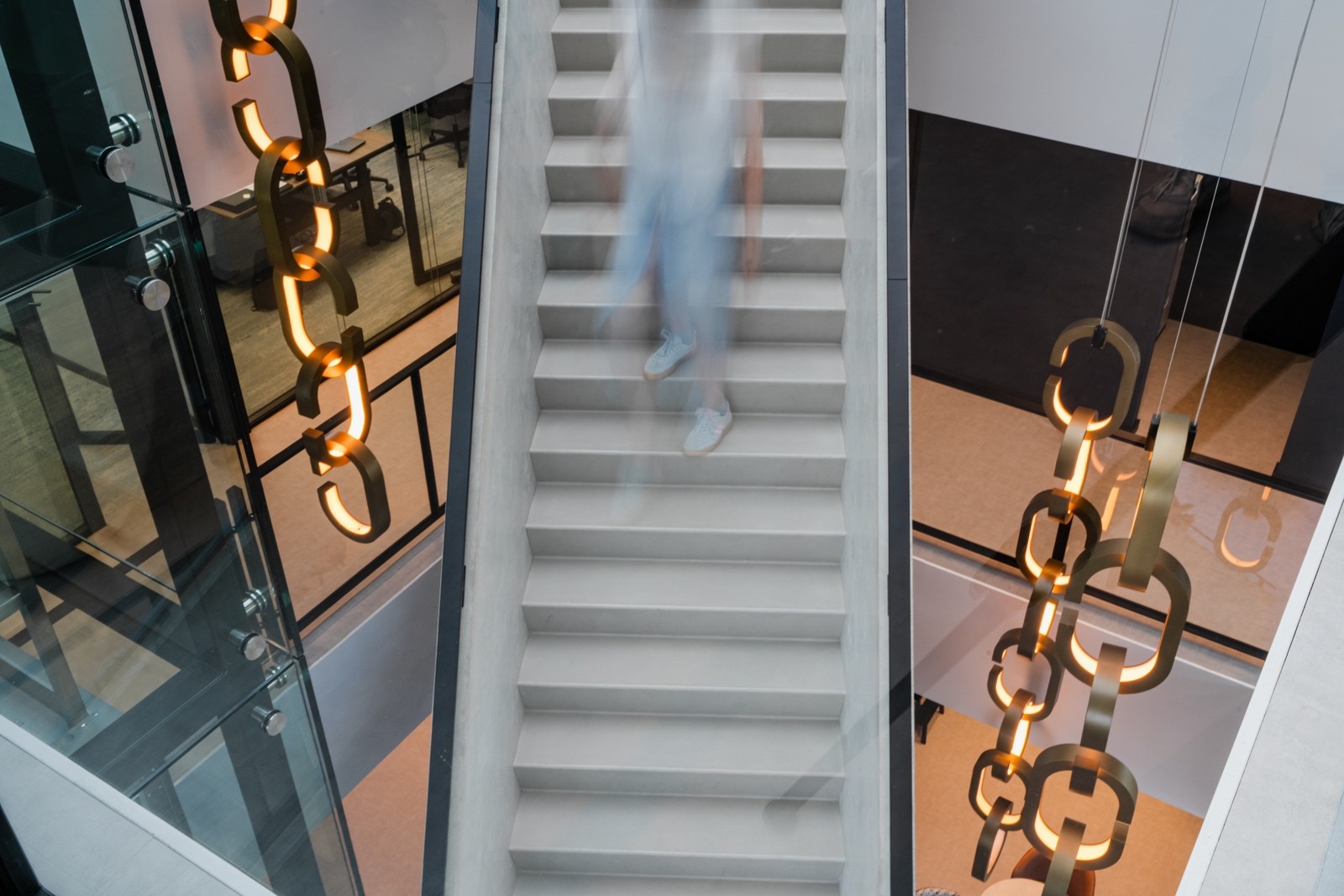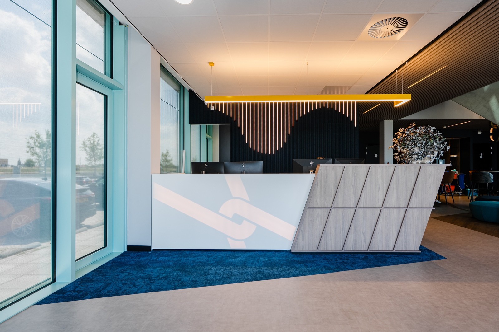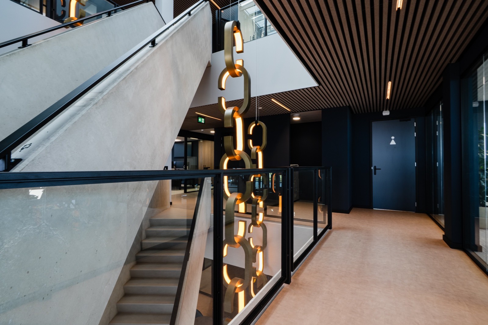 De entree zet meteen de toon. Een balie met een lichtgevend logo dat door het materiaal heen schijnt. Stoer en subtiel tegelijk. Langs de trap hangen enorme schakels die als een ketting naar beneden lopen. Een knipoog naar wat Multraship verbindt.