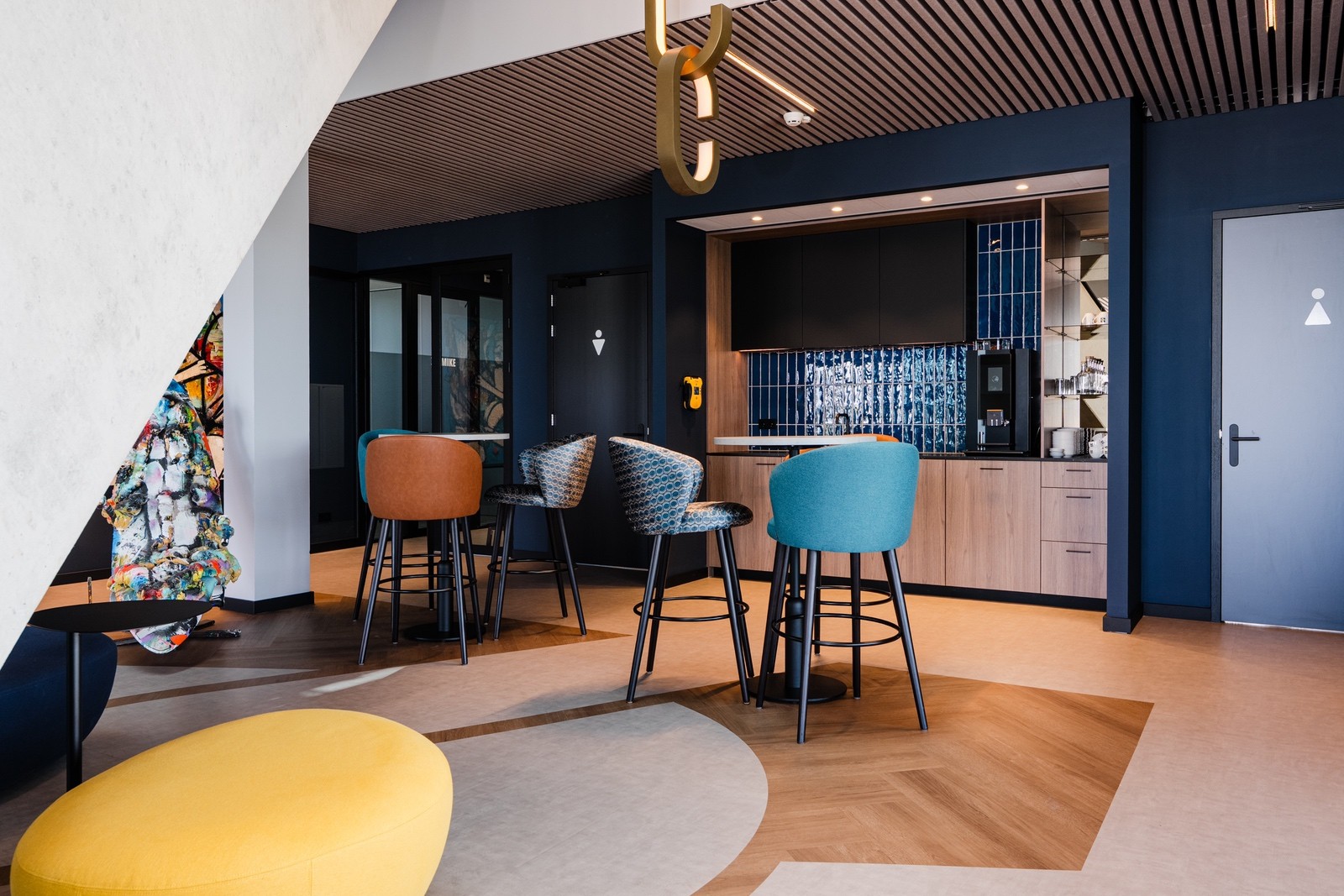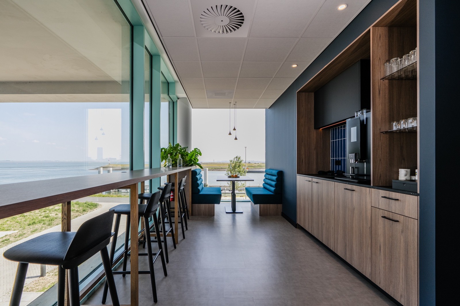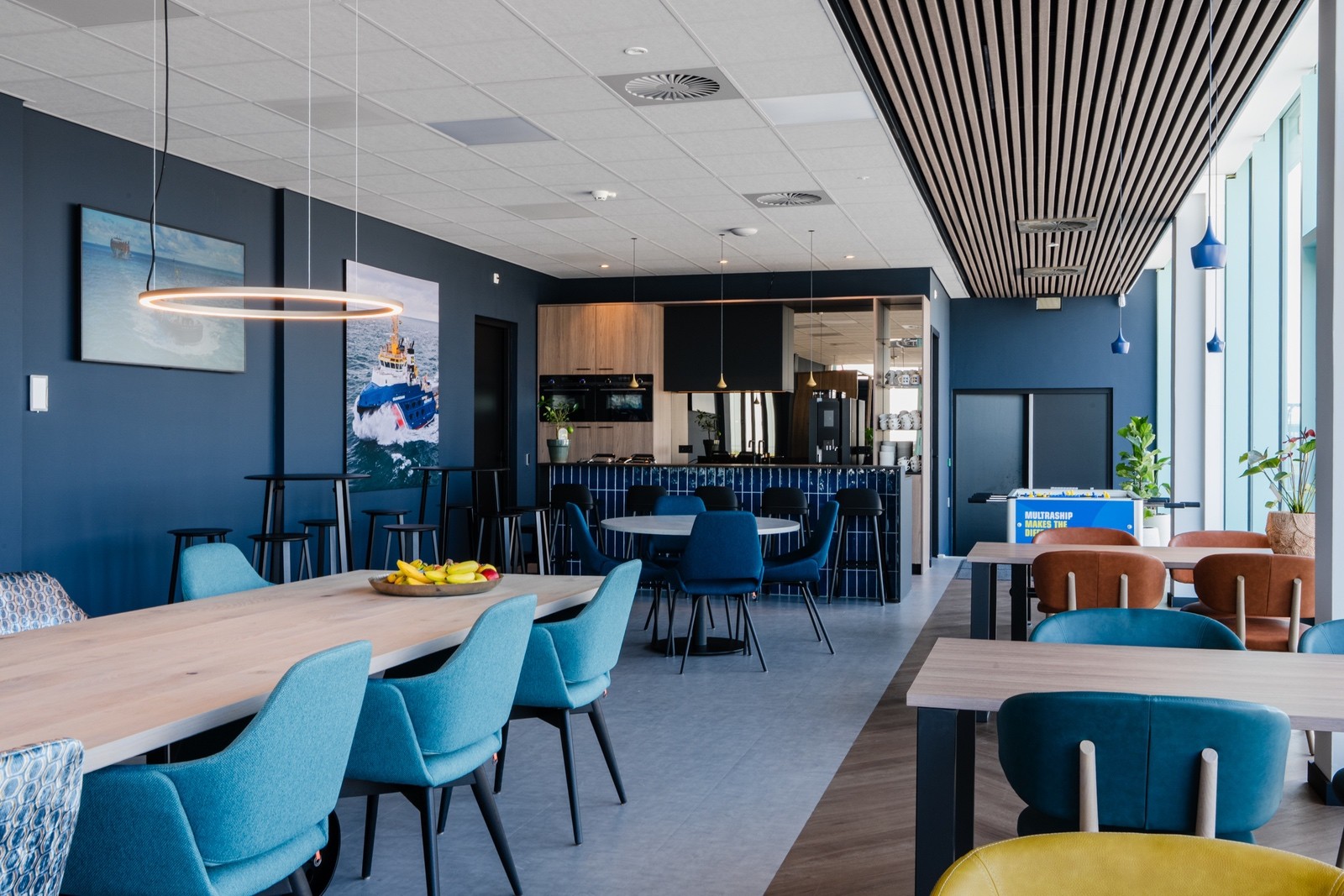 De Multra Lounge is het sociale hart van het kantoor. Geen kantine, maar een plek waar je kunt eten, overleggen of gewoon even landen. De kleuren van Multraship zijn subtiel verwerkt en aangevuld met warme tinten die het interieur karakter geven.
